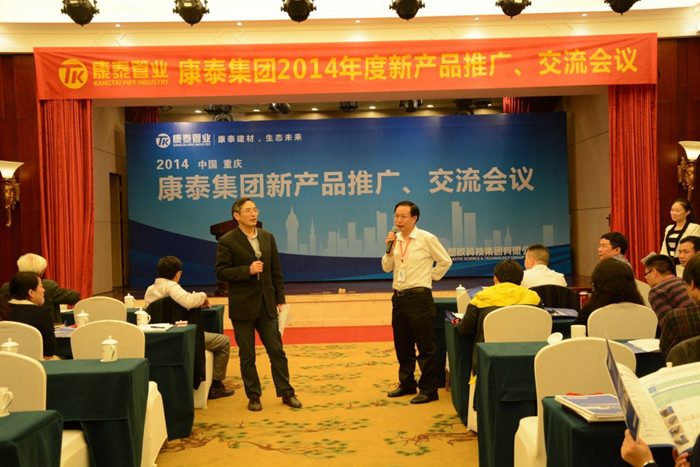 ???????此次康泰集團(tuán)2014年度新品(重慶)推廣、交流會(huì)議主題鮮明,宣傳海報(bào)林立、設(shè)置了新產(chǎn)品展示區(qū),集中展示康泰集團(tuán)2014年度研發(fā)的環(huán)保MPE、MPVE?排污管道系統(tǒng)、PP超靜音排水、排污管道系統(tǒng)、HDPE同層排水管道系統(tǒng)、加強(qiáng)型漩流降噪特殊單立管道系統(tǒng)五款新產(chǎn)品。歷時(shí)2.5小時(shí)的會(huì)議秉承“康泰建材,生態(tài)未來”,堅(jiān)持“科技、質(zhì)量、價(jià)值、共贏”的市場(chǎng)競(jìng)爭(zhēng)理念,致力于成為生態(tài)建材行業(yè)領(lǐng)導(dǎo)者企業(yè)。發(fā)展是永恒的主題,合作是時(shí)代的潮流。康泰以此次新品推廣交流會(huì)為契機(jī),共筑交流平臺(tái),以更加開放靈活的理念,更加務(wù)實(shí)的作風(fēng),更加科學(xué)完善的研發(fā)推廣政策,加強(qiáng)與社會(huì)各界合作交流,共同推進(jìn)行業(yè)的高標(biāo)準(zhǔn),可持續(xù)發(fā)展。會(huì)議高效、緊湊,圓滿結(jié)束。